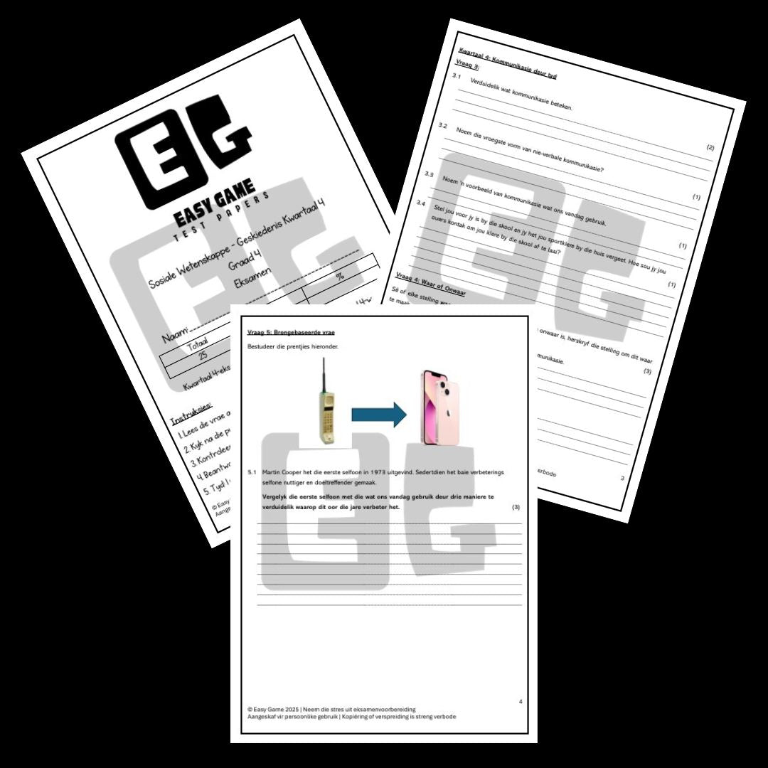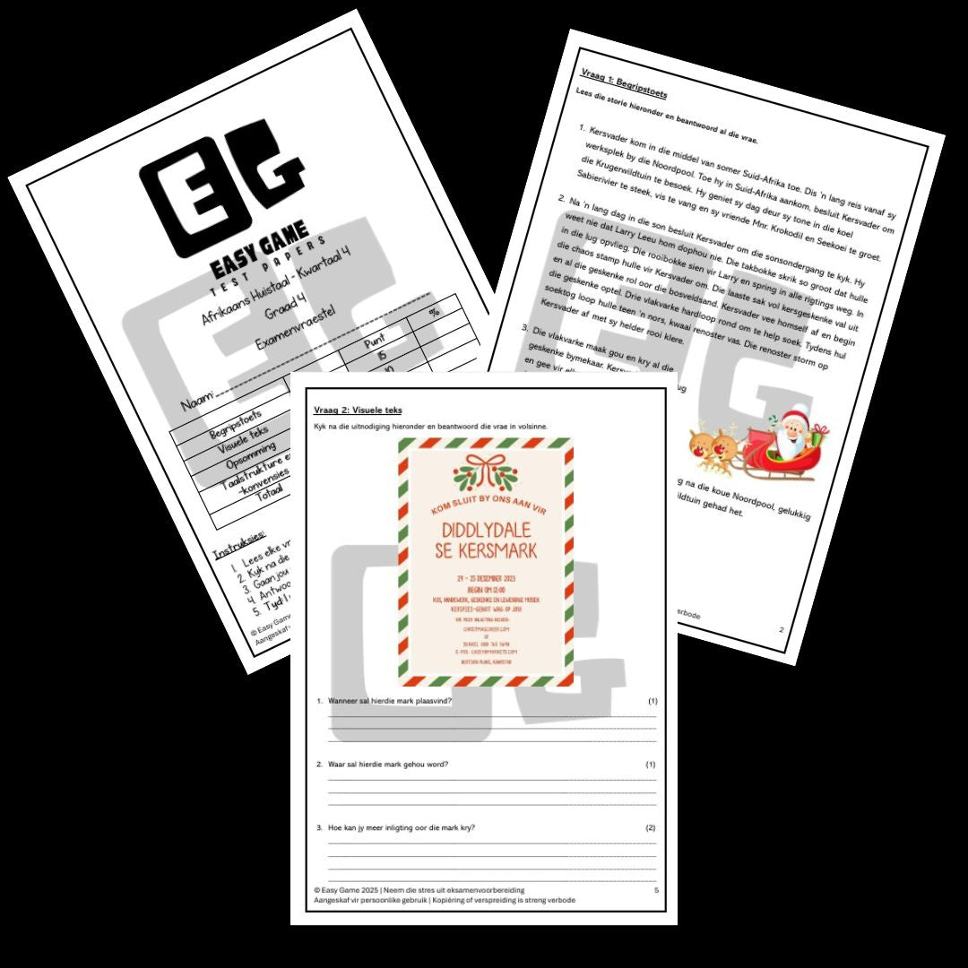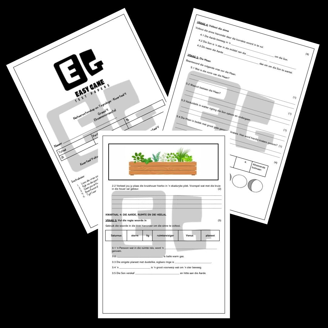 Hierdie volledige pakket sluit assesserings in Afrikaans Huistaal, English First Additional Language, Wiskunde, Geskiedenis, Aardrykskunde en Natuurwetenskap in - alles wat nodig is vir Kwartaal 4-evaluering.