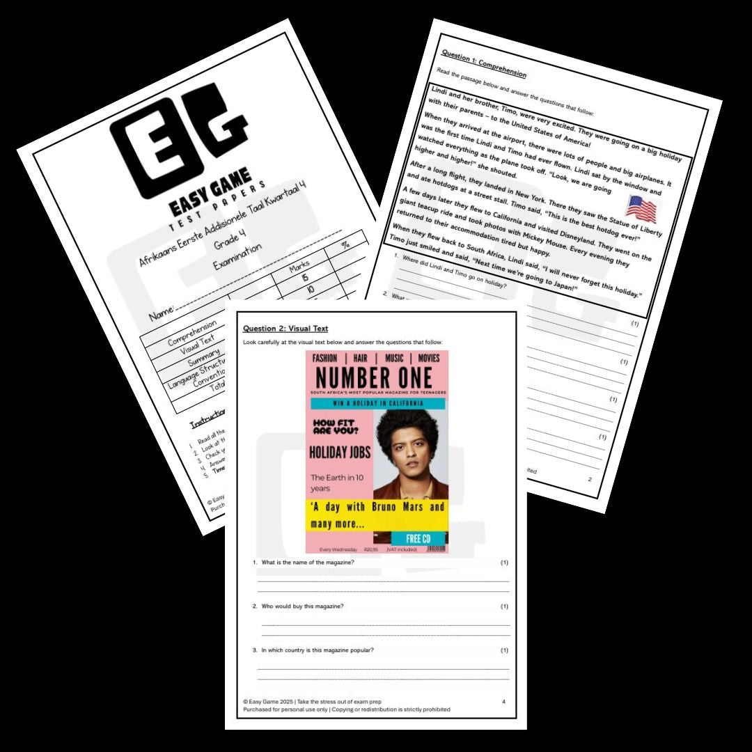 Elke toets kom met volledige memorandums, wat die nasienproses eenvoudig maak en duidelike antwoordgidse bied. Perfek vir ouers wat gereed-vir-gebruik, vakgerigte assesserings soek wat voorbereidingstyd bespaar terwyl deeglike vakdekking verseker word.